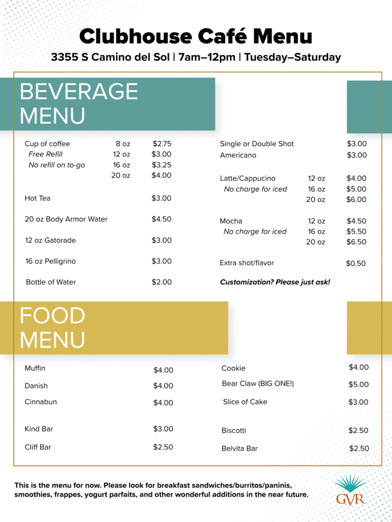 Find the Clubhouse Café at 3355 South Camino del Sol.